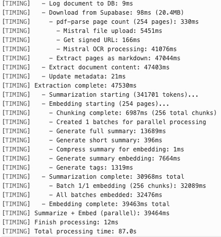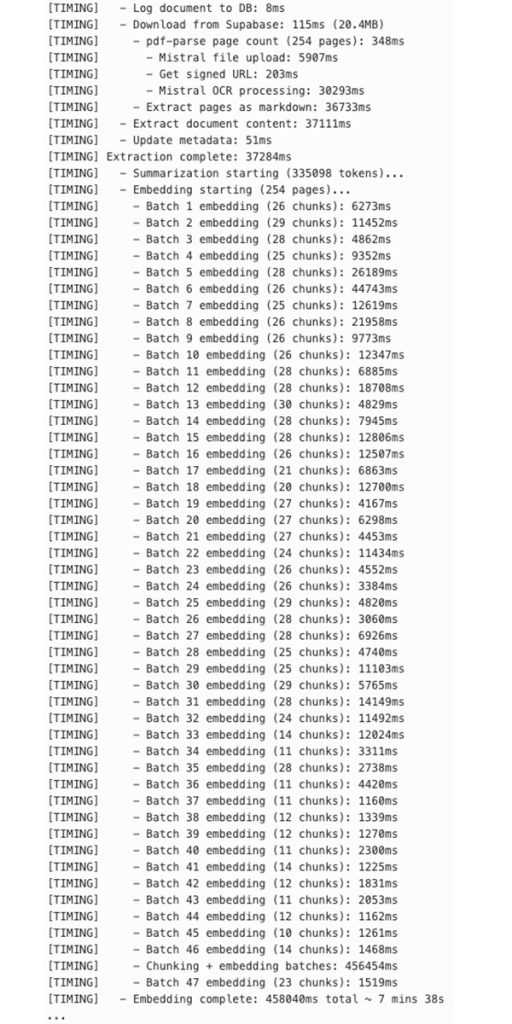 Dieses sequenzielle Abarbeiten der Batches war ineffizient, da die einzelnen Chunks völlig unabhängig voneinander waren. Deshalb haben wir diesen Vorgang parallelisiert, nachdem wir herausgefunden haben, dass wir über unsere Embedding-API nicht nur einen Batch pro Anfrage, sondern 512 Batches pro Anfrage schicken konnten. Zusätzlich haben wir die Generierung von einer Zusammenfassung des Dokuments, die bei entsprechender Größe auch einige Sekunden dauern kann, parallel zur Erstellung der Embeddings implementiert. Das hat signifikant Zeit eingespart, sodass das gleiche große PDF nun in weniger als zwei Minuten vollständig verarbeitet wurde.